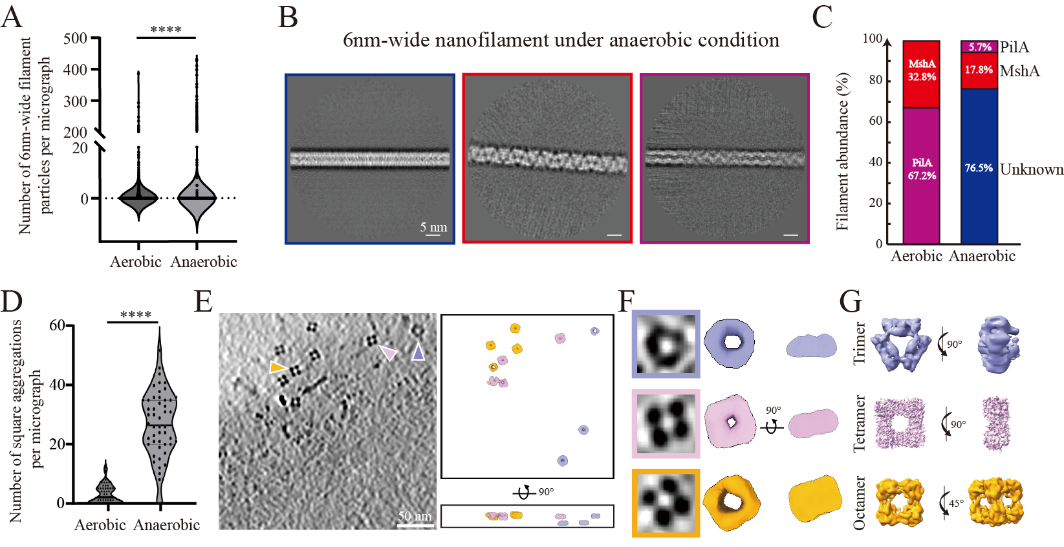 此外,研究团队通过cryo-ET在原位生物膜中观察到膜囊泡及多种规则多聚颗粒。通过基于深度学习的三维分割结合子断层平均,研究团队发现这些颗粒包含三聚体、四聚体和八聚体等不同形态。进一步比较有氧和缺氧条件下的生物膜结构发现,缺氧条件显著增加了6 nm纤维和方形聚集体的丰度,并诱导出现新的非周期性纤维类型,提示氧气限制会重塑S. oneidensis MR-1生物膜组成(图3)。