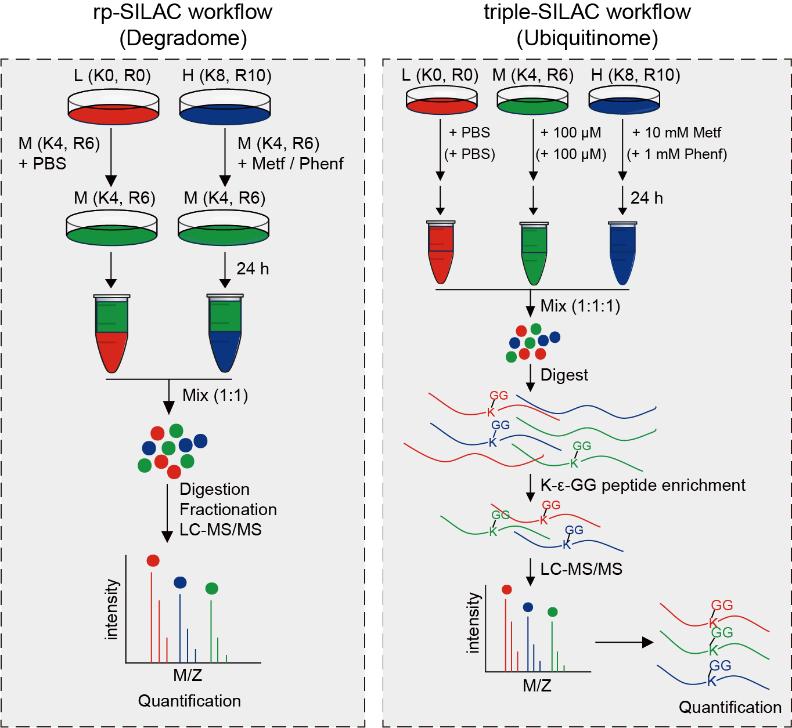 图1. 基于同位素代谢标记策略的实验流程。前者用于定量分析蛋白质降解,后者用于定量分析蛋白质泛素化。