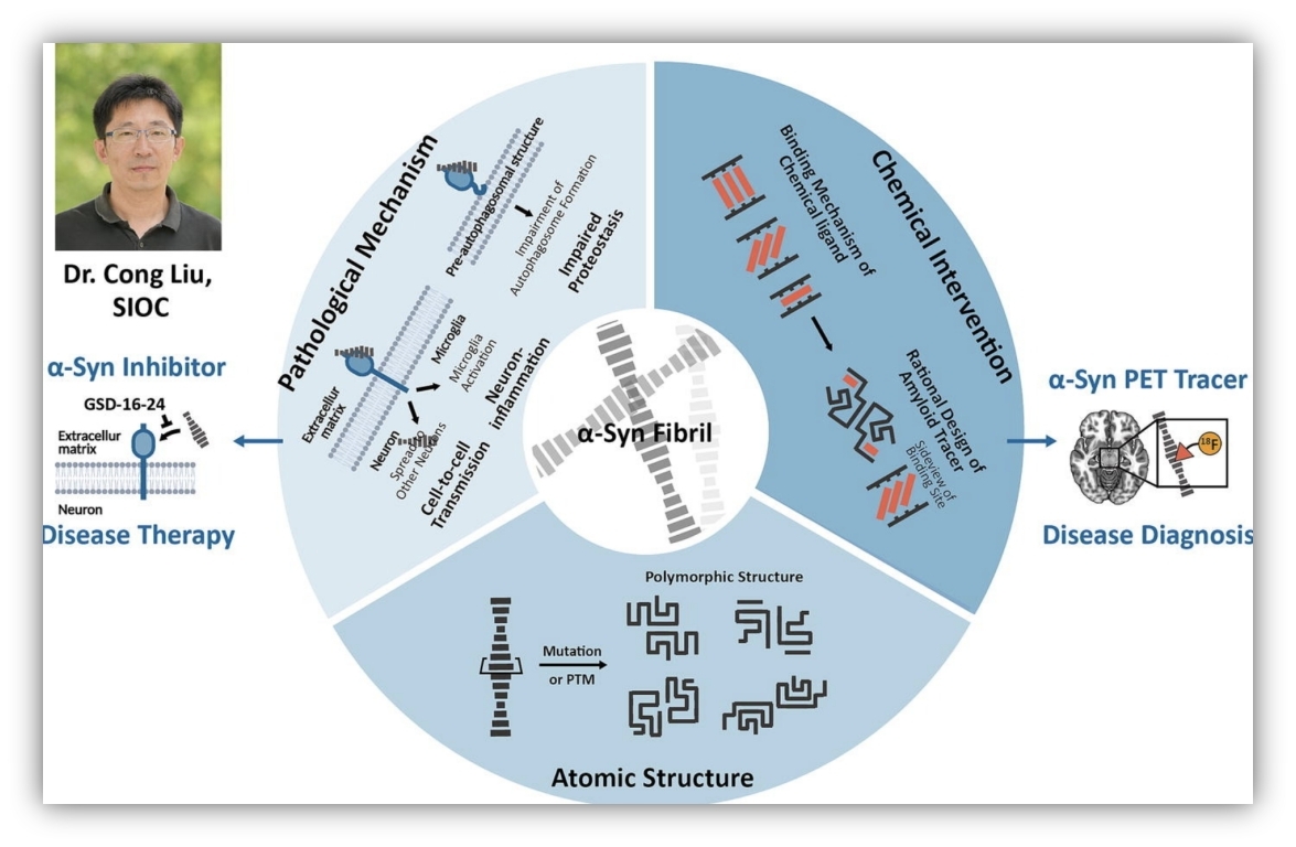 近日,中国科学院上海有机化学研究所生物与化学交叉研究中心刘聪研究员在《Journal of Molecular Biology》杂志的专刊 “Pioneers in Molecular Biology: China”受邀发表题为 “Rising Stars: Molecular Mechanisms and Chemical Interventions of α-Synuclein Amyloid Aggregation in Parkinson’s Disease”的综述性文章。帕金森病是仅次于阿尔茨海默病的第二大神经退行性疾病,其核心病理特征为α-syn异常聚集形成的淀粉样纤维。该综述文章回顾了刘聪团队十余年来围绕α-syn聚集展开的多学科交叉研究,涵盖高分辨率结构生物学、分子生物物理、生化与细胞功能分析及疾病动物模型研究。