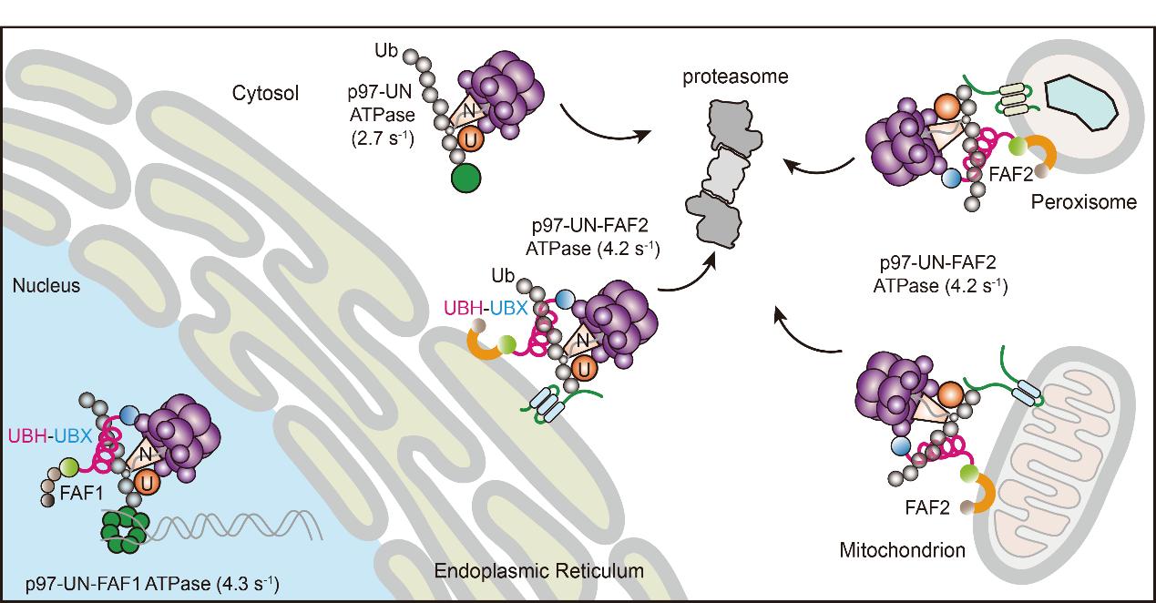 进一步的细胞实验显示,该模块不仅介入经典的ERAD途径,也参与线粒体相关蛋白的降解,以及过氧化物酶体的稳态维持。FAF2 的UBH缺失会削弱线粒体膜蛋白的降解效率,并导致过氧化物酶体过度被自噬清除。此外,FAF1上的UBH-UBX模块在DNA解旋酶复合体解聚过程中也发挥着关键作用,揭示了这一模块在多条质量控制通路中的广泛功能。