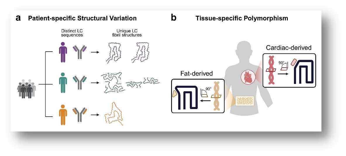 系统性轻链淀粉样变性(AL amyloidosis)是一类由免疫球蛋白轻链(Light chain,LC)异常折叠并形成淀粉样纤维沉积于多器官所致的严重疾病[1],其中心脏受累最为致命[2]。近年来,冷冻电镜技术在淀粉样纤维结构解析方面取得重要进展,但现有高分辨率结构解析所用的纤维样本几乎全部来源于尸检或器官移植后的组织,来自患者临床活检样本的淀粉样纤维结构仍长期缺失[3]。在此背景下,一个关键而悬而未决的问题是:临床常用、易获取的腹部脂肪活检样本中的淀粉样纤维结构,是否能够真实代表心脏等主要受累器官中的病理纤维构象?