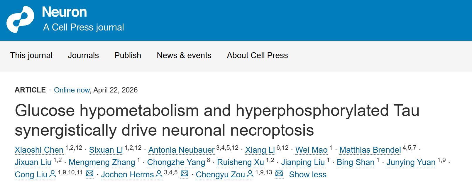 2026年4月22日,中国科学院上海有机化学研究所生物与化学交叉研究中心邹呈雨团队,联合交叉中心刘聪团队和德国慕尼黑大学/德国神经退行性疾病研究中心Jochen Herms团队,在Neuron在线发表题为 Glucose hypometabolism and hyperphosphorylated Tau synergistically drive neuronal necroptosis的研究论文。该研究首次揭示了葡萄糖代谢降低与p-Tau协同作用,通过调控RIPK1介导的程序性坏死(necroptosis)通路,驱动AD发生发展的分子机制。